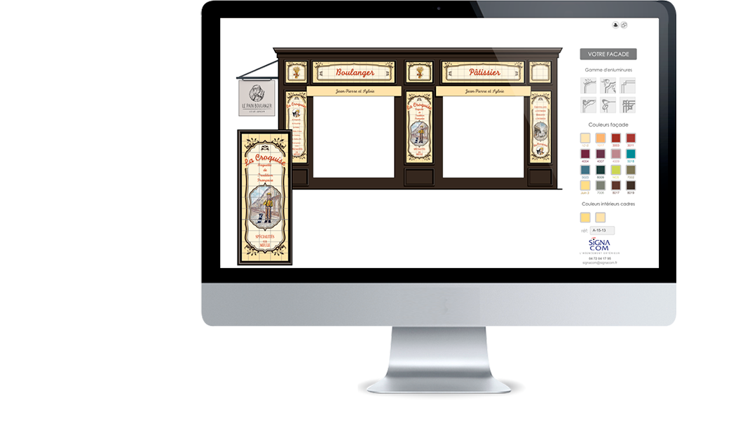 Signacom est un créateur d'enseignes et habilleur de façades. Le but était de créer une application interne d'aide à la vente pour les commerciaux permettant de personnaliser les façades des clients aux couleurs et motifs demandés.
